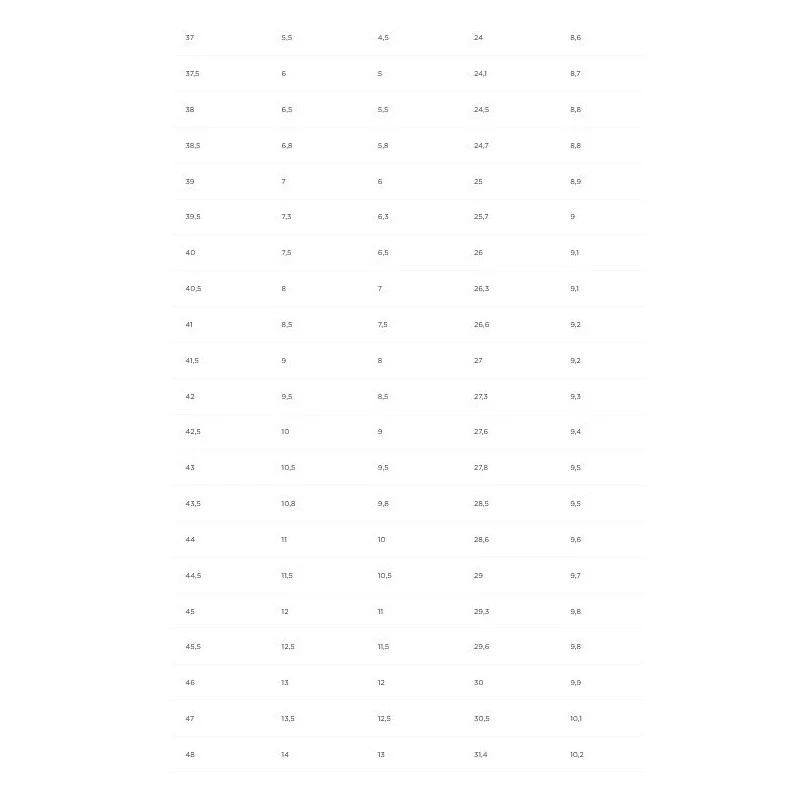 | Numero | 37, 37.5, 38, 38.5, 39, 39.5, 40, 40.5, 41, 41.5, 42, 42.5, 43, 43.5, 44, 44.5, 45, 45.5, 46, 47, 48 |